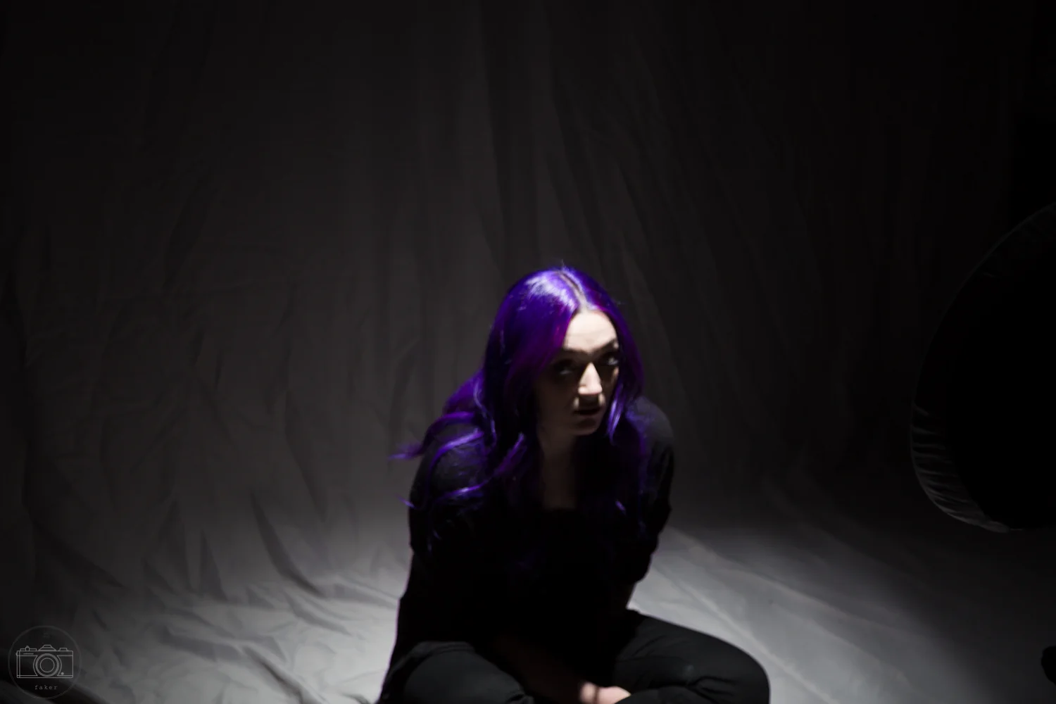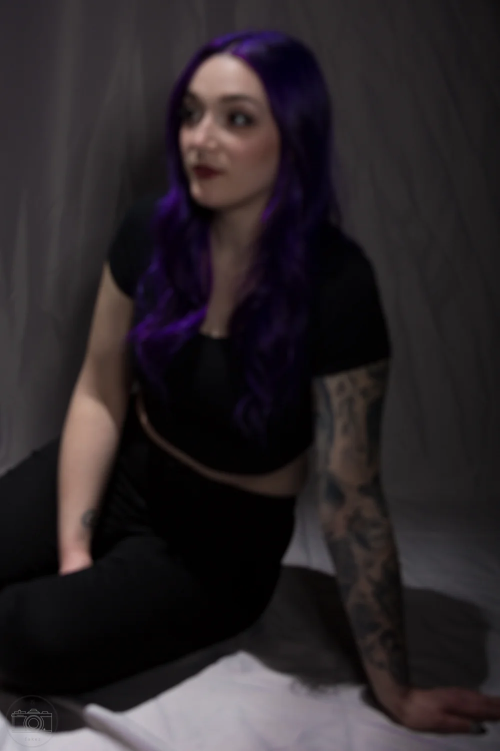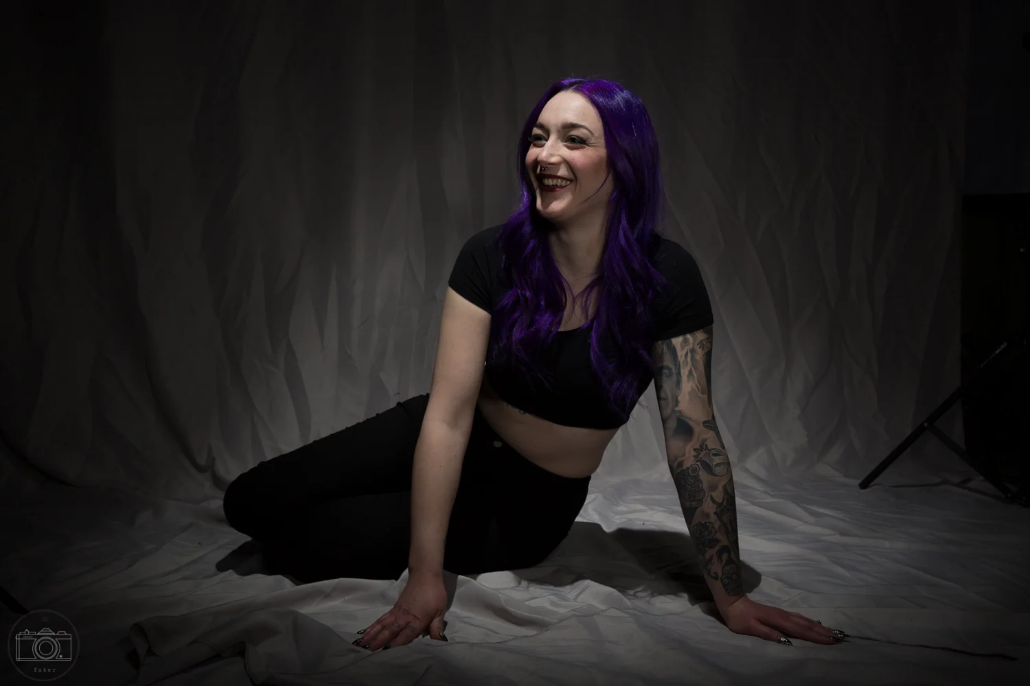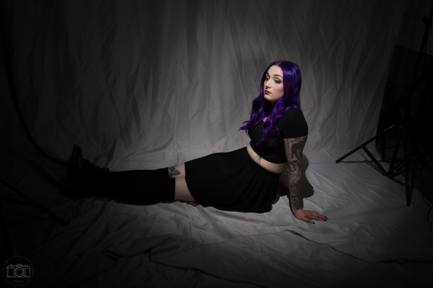 You can see a few things here -- first, we have the "cone" shape we want for the overhead exposure [good].  Also, Kristin's forehead, nose, and upper lip are properly exposed (give or take a butterfly shadow), as we want from the "key" light, even if her eyes are straight up goth deadpool [also good].  You can also see her amazing purple hair, which helped us so much in this  shoot.  ...You can also see the "texture" of the background turning into 3-D wrinkles as it runs along the floor [not good at all.]  The next step was to fill in the shadows on Kristin's face.  It took me a long, long time to pull this off, which is why she looks so justifiably bored: